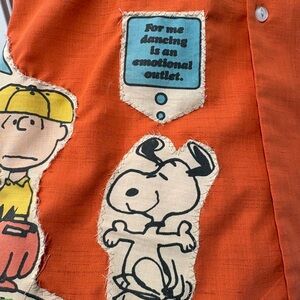 Stylish orange men's shirt featuring a unique graphic design. Perfect for casual outings. Created with all original material in 1960s Snoopy pillowcase on a late 1950s to early 1960s button up shirt. After around 3 days and 10 hours of sewing this was one of the more bold fabrics I’ve decided to use as it was very thin and hard to sew. No machines used in my process. This needs to be washed on a delicate cycle due to the nature of the fabric and the threads not being as tight as they can be due to this. I’ve worn this one a good few times but want to let someone else enjoy it. No size tag measures 24x30”
