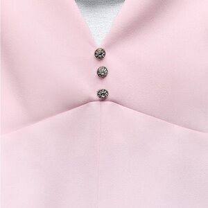 Zara sleeveless pinafore style dress with V-neckline. False jewel buttons at front and back bow. A-line silhouette. Side hidden in-seam zip closure.