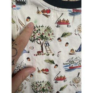 Soft cotton blend sleeper features a charming fall-themed camping and apple picking print throughout. Designed with long sleeves, ribbed navy blue cuffs, and a matching crew neckline, this one-piece includes a full-length front zipper for easy dressing and a protective snap tab at the neck. The back is detailed with a contrasting navy blue faux-flap "butt flap" for a classic pajama look. Note: There is a small faint green mark on the front near the apple tree graphic, as shown in photos.