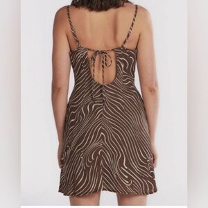 This Charlie Holiday Lola Mini Slip Dress features a retro-inspired zebra print in rich chocolate brown with soft ivory striping. The silky drape and lightweight fabric make it perfect for warm weather, layering, or year-round styling.