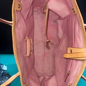 She’s a vintage and simply a trial for Dooney and Bourke. The floral in the end did not work for them. Which makes this purse a collectible. Bold red floral pattern. Sturdy tan handles. Stylish and functional. Callouts in photos