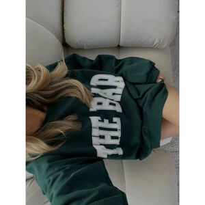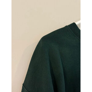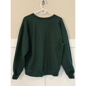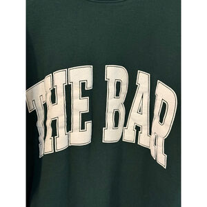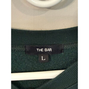 This is a pre-owned women's "THE BAR" varsity sweatshirt in hunter green with a white "THE BAR" logo across the chest. The sweatshirt features a crew neck, long sleeves with ribbed cuffs, and a ribbed hem. It appears to be made of a soft, possibly cotton-blend fabric. The fit is oversized, as indicated by the product description in the first image. There are significant imperfections or signs of slight wear and small fade on right shoulder (see photo) that’s not really noticeable, but worth noting. The size is large