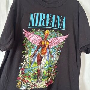Black t-shirt featuring a colorful Nirvana graphic with pink, blue, and green accents.
