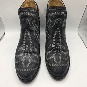 These striking ankle boots feature a distressed black leather exterior with intricate grey vine embroidery, offering a sophisticated western-inspired aesthetic. Designed with a deep V-cut shaft and a convenient side zipper, they provide both style and ease of wear. The premium construction includes a full leather interior for lasting comfort and durability, while the low stacked block heel ensures stability for all-day use. A textured outsole provides reliable traction, making these versatile booties a perfect pairing for denim or dresses.