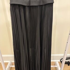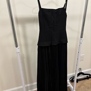 Elegant black backless dress. Features pleated skirt. Perfect for evening wear.