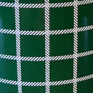 Set of 2 enamel-look, campfire style ceramic mugs, one in vibrant red with a clean, white-and-red checkered geometric grid pattern contrasted by a solid red handle; the other in forest green in the same pattern. Both have cream-colored interiors and a thin black rim that provides a "vintage-style" or "enamel-look" finish to the ceramic. Large and comfortable easy-to-grip handle. Each measures 3.75” tall with a 3.75” diameter; 5.75” across including handle. Holds 16 fluid oz. From Hallmark.