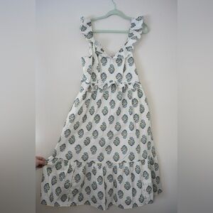 Keywords: J.CREW Factory dress, J Crew Crevo dress, women’s size 10 dress, white floral midi dress, blue floral dress, ruffle neckline dress, tiered midi dress, spring dress, summer dress, Easter dress, baby shower dress, bridal shower guest dress, vacation dress, resort wear, feminine cottagecore dress, romantic midi dress, whimsy-core, modest summer dress, family photo outfit, brunch dress, garden party dress, coquette girl, lightweight cotton dress, classic preppy style, effortless chic dress, whimsical, pockets
