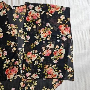 Sheer floral kimono wrap in a classic black colorway featuring a vibrant rose pattern. This lightweight layering piece is designed with an open front, wide kimono-style sleeves, and a dramatic high-low curved hemline. Crafted from a breathable polyester chiffon, it offers a relaxed, airy silhouette perfect for beach days or dressing up a simple outfit. Note: Small area of loose stitching/snagging as shown in photos.