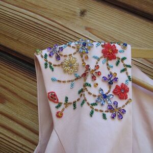 Elegant A-line gown accented with a plunging neckline and intricate bead-and-rhinestone floral accents across the shoulders and upper back.