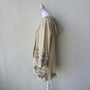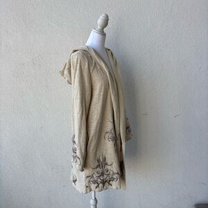 Cream colored hooded cardigan with floral embroidery in a style that resembles Johnny Was
