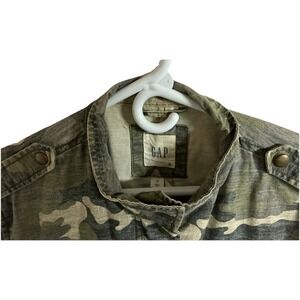 The Gap Camo Utility Jacket for women in olive green features a military-style design with embroidered butterfly pockets, adding a unique and stylish touch to the garment. Made from 100% cotton with a mid-length fit, this jacket is perfect for casual or travel occasions in any season. The zip and snap closure, along with the long sleeves, ensure both comfort and convenience. The jacket also includes multiple pockets for added functionality. With a theme that incorporates nature, western, army, and colorful elements, this Gap jacket is a versatile and fashionable addition to any wardrobe.