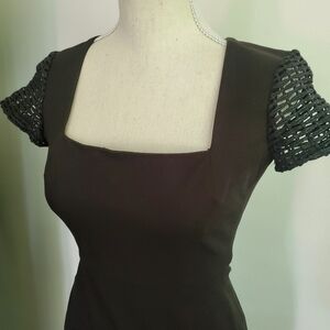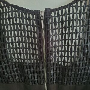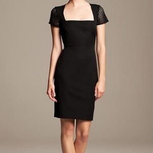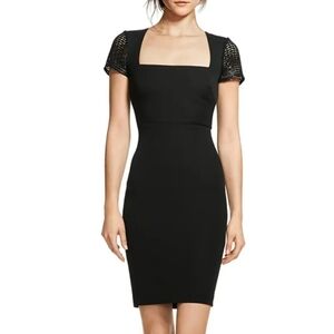 Roland Mouret for Banana Republic edgy plack pencil dress with open pattern sleeves and back, with back zipper. This dress is perfect for ladies night, bringing a little edginess to the office, or even running around town!
