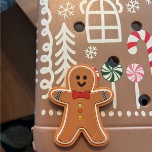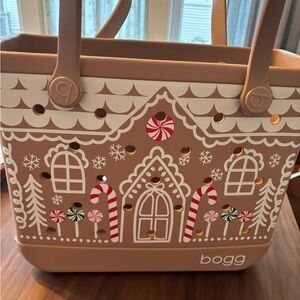 Charming brown tote bag with gingerbread house design. Perfect for festive outings. Used. Minor paint flaw in b of bogg. Gingerbread man included.