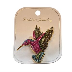 Brand new, hummingbird brooch with pave set rhinestones in pink, blue and green with a goldtone metal setting. Excellent condition. Made of high quality alloy and enamel technology that ensures lasting color without discoloration