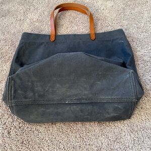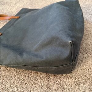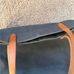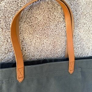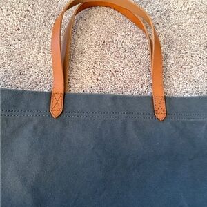 Stylish Madewell tote in dark blue canvas. Features tan leather handles. Perfect for everyday use.