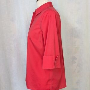 Chic and versatile button-up shirt. Vibrant red hue. Perfect for casual or dressy looks. Three quarter sleeves, non iron. Chico's size O. (US Small)
