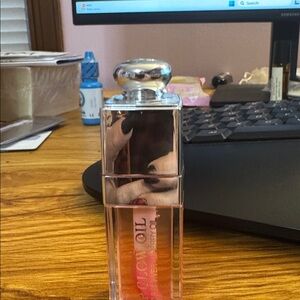 Luxurious lip oil by Dior. Infused with cherry oil. Features a sleek silver cap and pink hue.