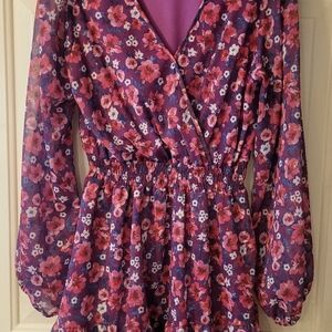 Chic dress with a vibrant purple base. Accented with pink floral details. Perfect for any occasion. Sheer sleeves make this the perfect option spring or summer. very feminine and romantic. excellent used conditon.