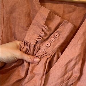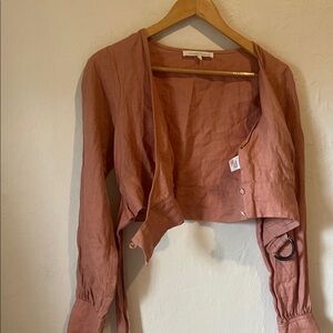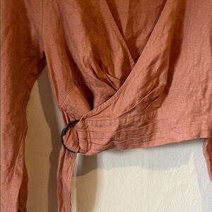 Cutest strawberry milkshake pink cropped wrap top! Made with 💯 linen, it’s cool and comfortable to wear. Secures across the chest with two interior buttons and a ribbon cinch belt. Billowing romantic sleeves with series of three cuff buttons. Its stylish design and comfortable fit make it a must-have in your wardrobe this spring/summer!