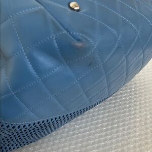 Rare blue authentic Chanel bag with silver hardware and chain handles. Preloved, in nice condition.