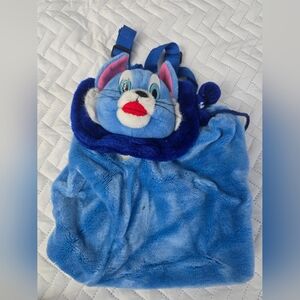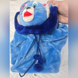 Amazing one of a kind 90's cartoon fuzzy bucket bag stuffed animal backpack with pompom drawstrings. Does show signs of wear as shown (seam opening, faded eyes, dark spot).