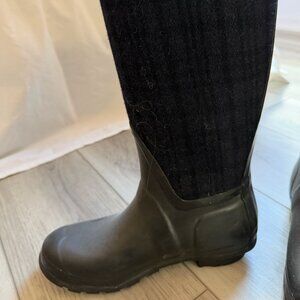Tall/Black Hunter boots in size 7. The top section is more of a fabric/soft material, and the bottom is the classic waterproof material. Great for snow and rain wear!