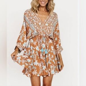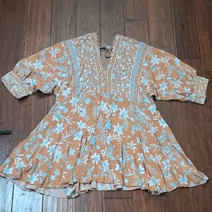 Baltic Born Adria Tan Dress with Blue & White Floral Print size Large
