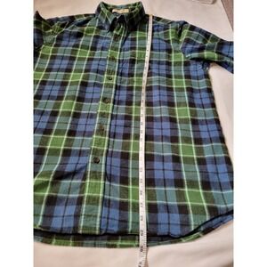 LL Bean Men's Flannel Shirt in size M Regular offers a classic traditional fit in a plaid design featuring green and blue colors. This button-up shirt with a collared neckline is perfect for various occasions such as travel, casual wear, work, and business meetings. Made from comfortable cotton flannel fabric, this shirt is suitable for winter, fall, and spring seasons. With its reliable quality and timeless appeal, it is a versatile addition to any man's wardrobe, ideal for both everyday wear and more formal occasions.