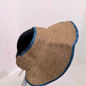 Chic brown sun hat featuring a blue trim. Perfect for sunny days. Packable and travel friendly. Velcro closure at the back. Pet free smoke fees home NWT