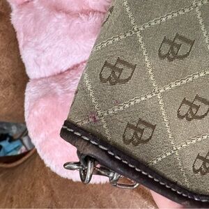 Elegant clutch with signature logo pattern. Features a secure snap closure and wristlet strap. Ideal for versatile styling.
