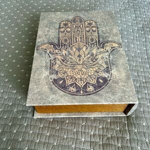 Elegant journal featuring a Hamsa design in gray and gold. Perfect for holding items or use for decor. New!