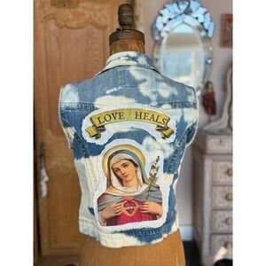 Handmade, upcycled American Rag denim vest featuring a bleached finish and a bold Sacred Heart artwork patch with "Love Heals" lettering on the back.