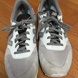 New Balance sneakers in gray and white. Features vibrant blue and green accents on the sole.