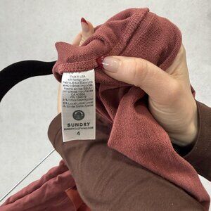 Tag information: Interior woven label shows Sundry branding with logo; secondary tag notes Made in USA and size 4. Care label lists fabric content 61% cotton, 35% lyocell, 4% spandex, includes RN# 134579 and CA 45648, references , and provides standard machine-wash cold and tumb