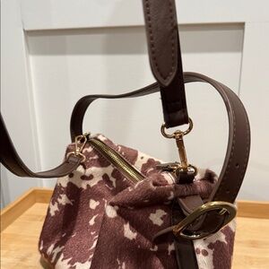 Medium size women's bag featuring a unique brown and cream cow print design. Soft textured with shoulder and crossbody straps. Crossbody strap is detachable, shoulder isn’t. Straps are dark brown faux leather with gold tone hardware.