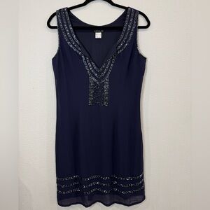VENUS Navy Beaded V-Neck Sleeveless Dress Size 2 Double Layer Sheer Overlay