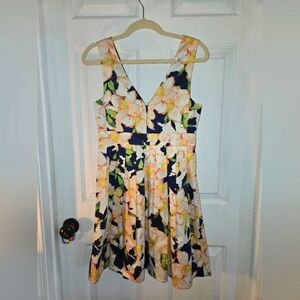 J. Crew Navy Yellow Orange Cotton Floral Pleated V-Neck Dress