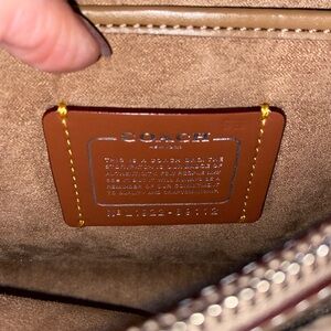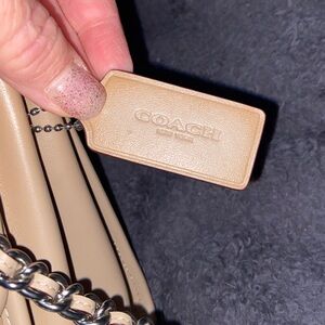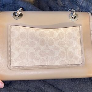 Beautiful Coach Parker shoulder bag in tan leather with signature canvas detail and silver chain strap. Features the iconic Coach tea rose turnlock closure and a classic structured silhouette.