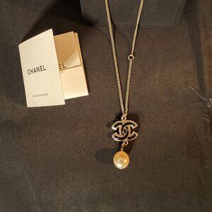 The pendant features a black enameled Chanel CC logo, set in silver with ornate embellishment and a dangling faux pearl.