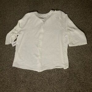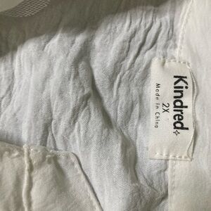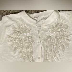 Elegant Kindred button-front blouse featuring stunning hand embroidery on both sides of the chest. Delicate clear sequins and synthetic (faux) pearls create a floral burst design that catches the light without being too flashy. Soft crinkled fabric, 3/4 sleeves and a relaxed fit make it perfect for dressy occasions, holidays or special events.