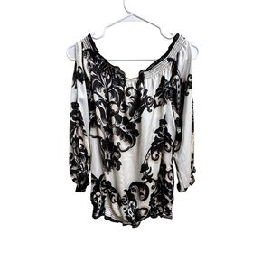 Elegant White House Black Market women’s blouse in a classic black and white floral print. Features off-shoulder neckline with elastic trim, slit sleeves for added style, and a flattering relaxed fit. Perfect for work, evening, or casual chic looks.
