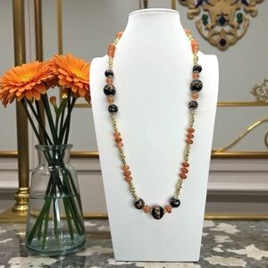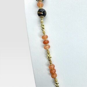 ARTISAN Handmade by me (Amber) necklace featuring a mix of black handmade vintage Murano Lampwork glass and gray Carnelian gemstones with 18k gold-filled spacer beads. Gold-tone lobster clasp closure. Piece is signed with "ASD" Artisan hang-tag.