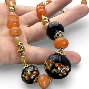 SOLD-ARTISAN Vintage Black Murano Lampwork Glass and Carnelian Gemstone Necklace
