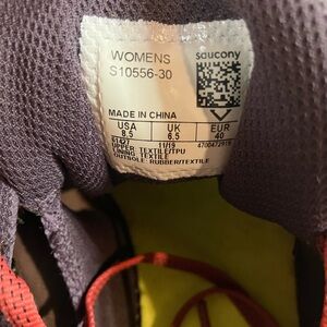 Saucony trail shoes featuring a sleek gray design with vibrant red accents. Perfect for rugged terrains.