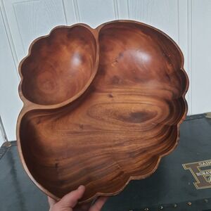 Vintage Hand Made Monkey Pod 2 Compartment Shell Scallop Wood Salad Chip Bowl