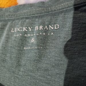 Stylish green t-shirt by Lucky Brand. Comfortable and casual. Size s, no rips Embroidered details on the sleeves. It does have a stain on the front. I originally had thought i got water on it during posting but it did not dry off. Im going to try and wash it, but this it how it currently looks. Ill edit pictured again if it comes clean!