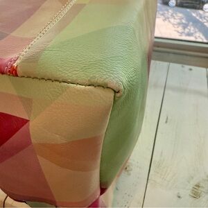 Stylish travel bag with geometric pastel design. Features Betsey Johnson logo. Perfect for travel.