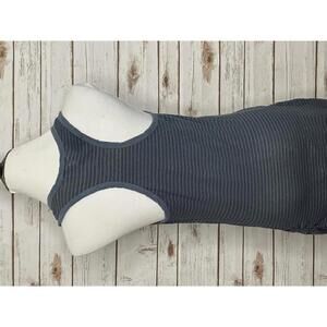 Grey/blue striped pattern; scoop neck; sleeveless; racerback; ruched sides; straight hem