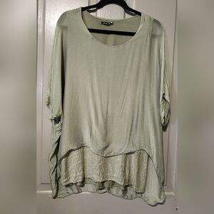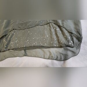 Italian-made Boutique Lagenlook style 100% silk blouse featuring a sheer silk top layer and a sequined inner lining with an asymmetrical hem. Beautiful silver green color. Soft fabric and relaxed fit offer both comfort and elegance. A must-have for your wardrobe. See pictures for measurements. Under layer is fairly stretchy. Great condition!