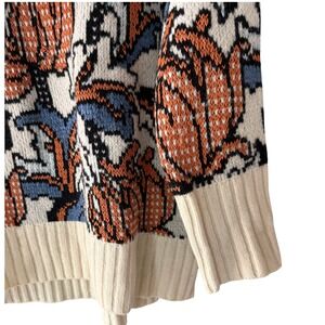 Beautiful Anthropologie Eris sweater featuring a bold floral jacquard knit in warm rust, navy, and cream tones. This piece has an effortless oversized silhouette with drop shoulders and wide ribbed trim at the hem and cuffs. The mixed knit texture gives it that signature Anthropologie boho-artsy feel — cozy but elevated.